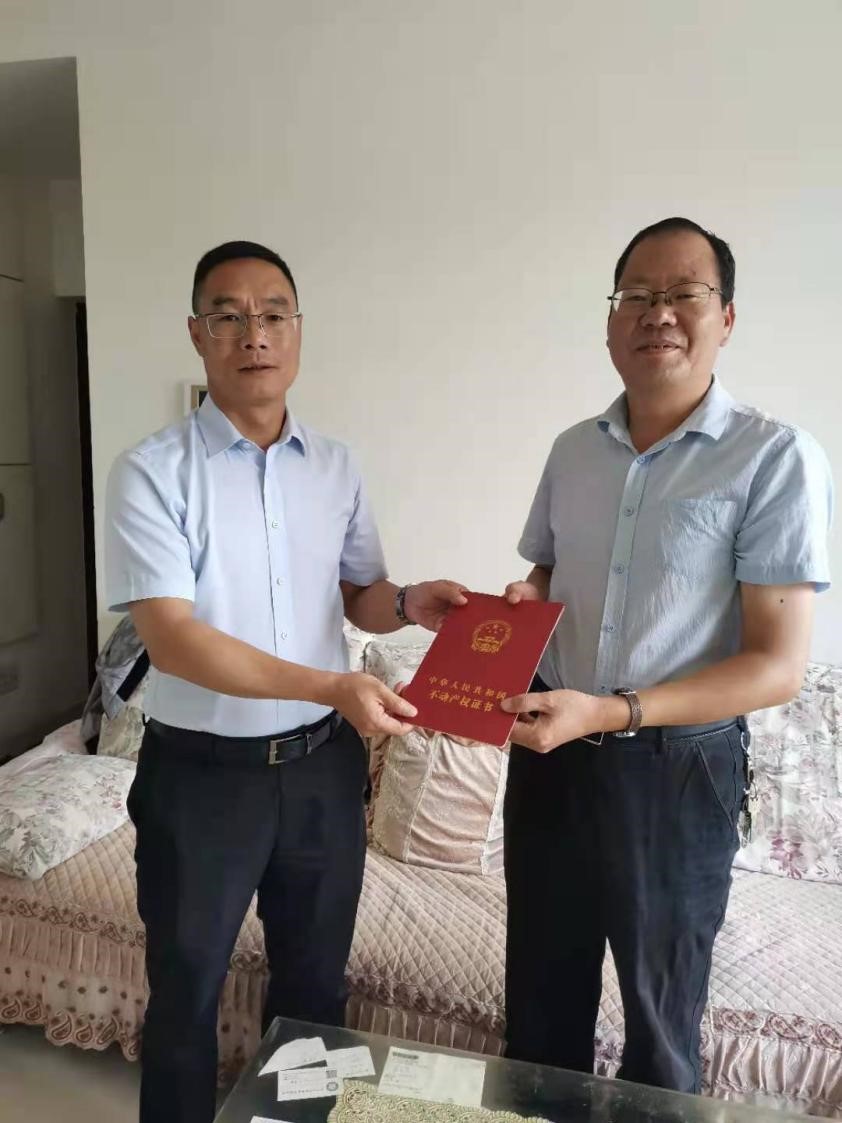 經(jīng)過總部廣大職工住戶及公司長時(shí)間的努力及多方面的溝通協(xié)調(diào),7月16日,總部職工家屬生活區(qū)首批16本不動(dòng)產(chǎn)權(quán)證書辦理完畢,正式交到公司。當(dāng)日,公司黨委書記高劍帶領(lǐng)工作人員親自將不動(dòng)產(chǎn)權(quán)證書送到職工住戶手中。
