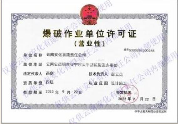 路雖遠(yuǎn),行則至;事雖難,做則成!金秋十月,經(jīng)過多方協(xié)調(diào),云南安化有限責(zé)任公司取得營業(yè)性爆破作業(yè)單位許可,與之前取得的生產(chǎn)許可證、危險貨物運(yùn)輸?shù)缆方?jīng)營許可證成為公司啟動現(xiàn)場混裝作業(yè)資質(zhì)的必備三證,為實(shí)現(xiàn)公司爆破服務(wù)一體化進(jìn)程提供了資質(zhì)保證。